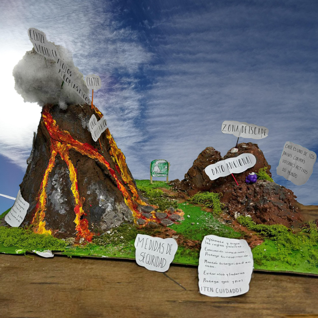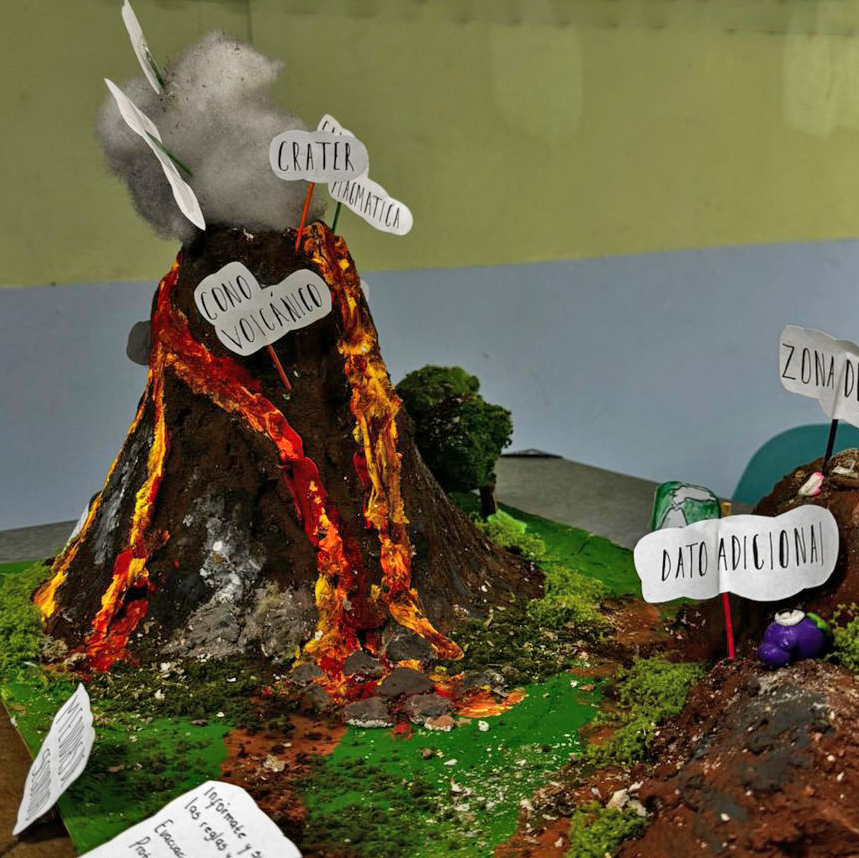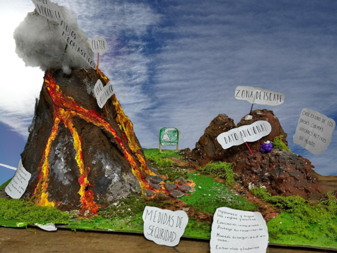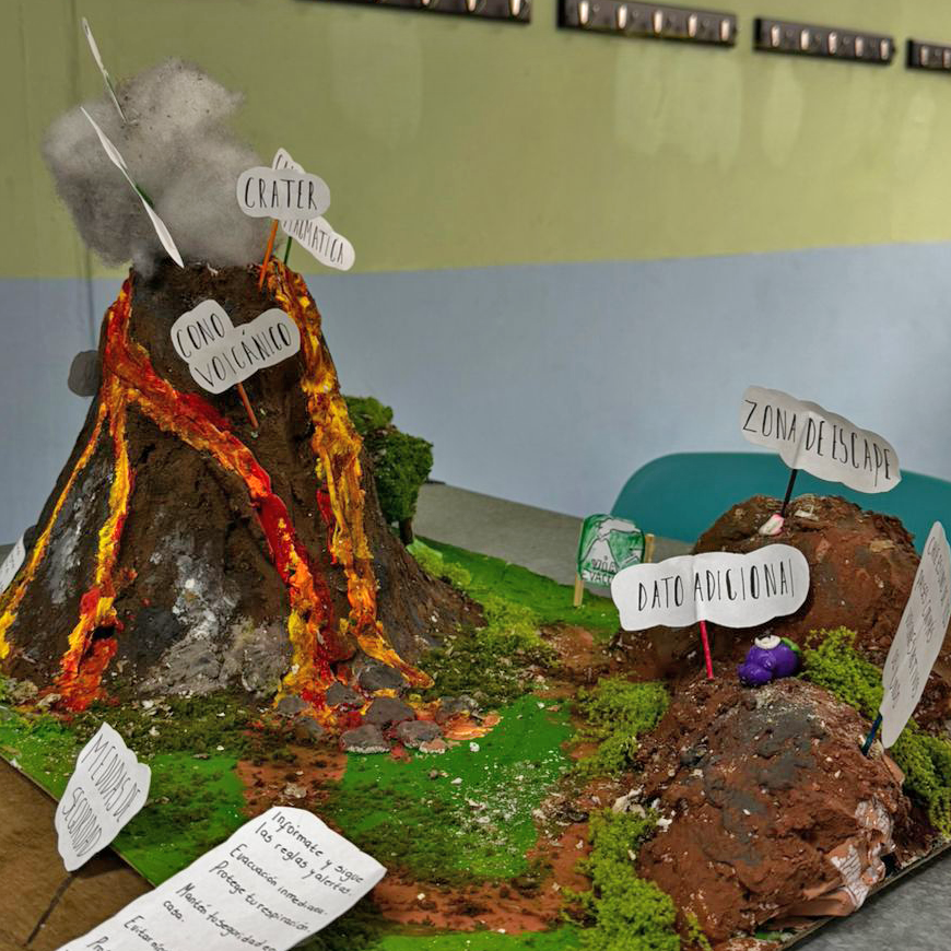 Los estudiantes de 4° Medio A presentaron una maqueta de erupción volcánica, donde expusieron los riesgos asociados a este fenómeno natural y las principales medidas de seguridad y prevención para la comunidad. La actividad permitió unir creatividad, investigación científica y conciencia ciudadana frente a desastres naturales. Se destaca el compromiso y el excelente resultado alcanzado por este grupo de estudiantes.